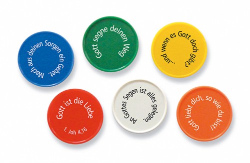 Aus Kunststoff, verpackt in einer Tüte. Gute Botschaften verschenken! Einkaufswagenchip rein in den Einkaufswagen und nach dem Einkauf einfach stecken lassen und dadurch Menschen zum Nachdenken anregen!