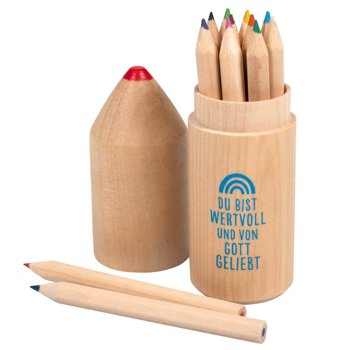 12 Holzbuntstifte in einer stabilen Dose aus Holz verpackt, er wie ein großer Stift aussieht.