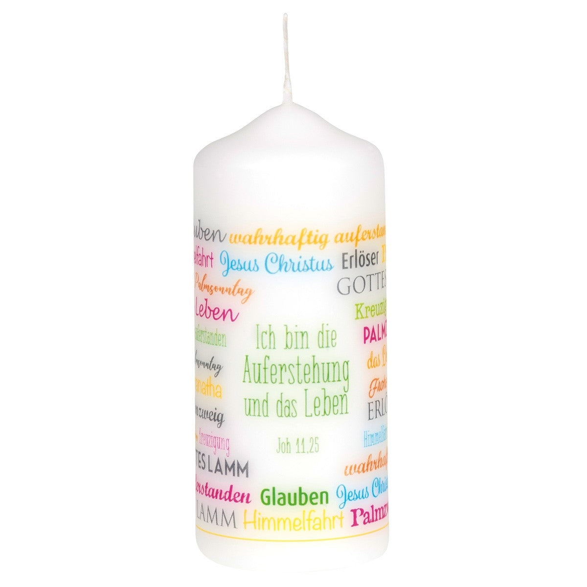 Verschenken sie zu Ostern diese schöne bunte Kerze mit Text. Um den Bibeltext sind Wörter gedruckt, die unsere Osterzeit prägen. In Cellophan verpackt. Aus deutscher Kerzen-Manufaktur.