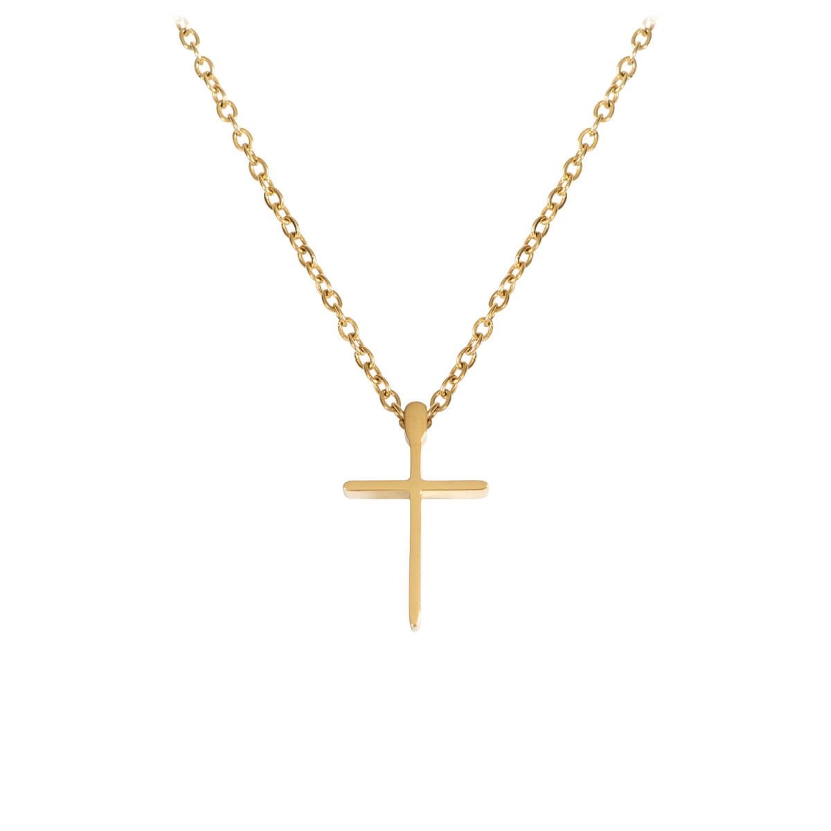 Moderne Halskette mit Kreuz aus glänzendem Edelstahl mit Goldauflage. Länge Halskette ca. 40 cm, verlängerbar auf 44 cm; Kreuz 1,5 x 2,7 cm; verpackt auf Karte.