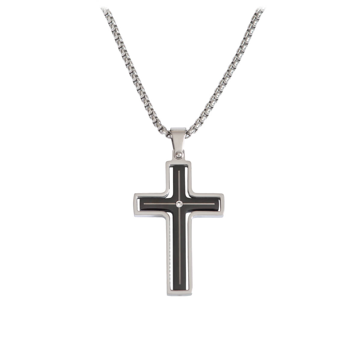 Modische Gliederkette mit großem Kreuz aus glänzendem Edelstahl. Das innere schwarze Kreuz ist mittig mit einem Strass-Stein veredelt. Länge Halskette ca. 40 cm, verlängerbar auf 44 cm; Kreuz 2,5 x 4 cm; verpackt auf Karte.