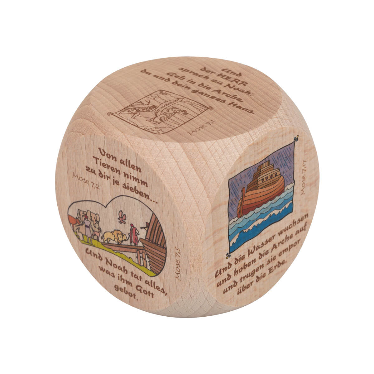 Schöner Gebetswürfel aus Buchenholz natur, mit Bildern zu der Arche Noah. Gebetswürfel mit der Geschichte vom Bau der Arche durch Noah in Kurzform. Spielerisch können die Kinder lernen die ganze Geschichte vom Bau mit eigenen Worten auszuschmücken, zu erzählen.