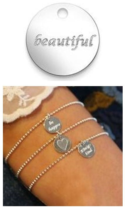 Diese zauberhafte Armkette mit rundem Anhänger und Botschaftsgravur ist ein absoluter "Hingucker". Ein echtes Must-Have für jeden, der etwas ganz Persönliches schenken oder tragen möchte, klasse auch als Freundschaftskette und perfekt zum Kombinieren mit mehreren Armbändern und Armketten.