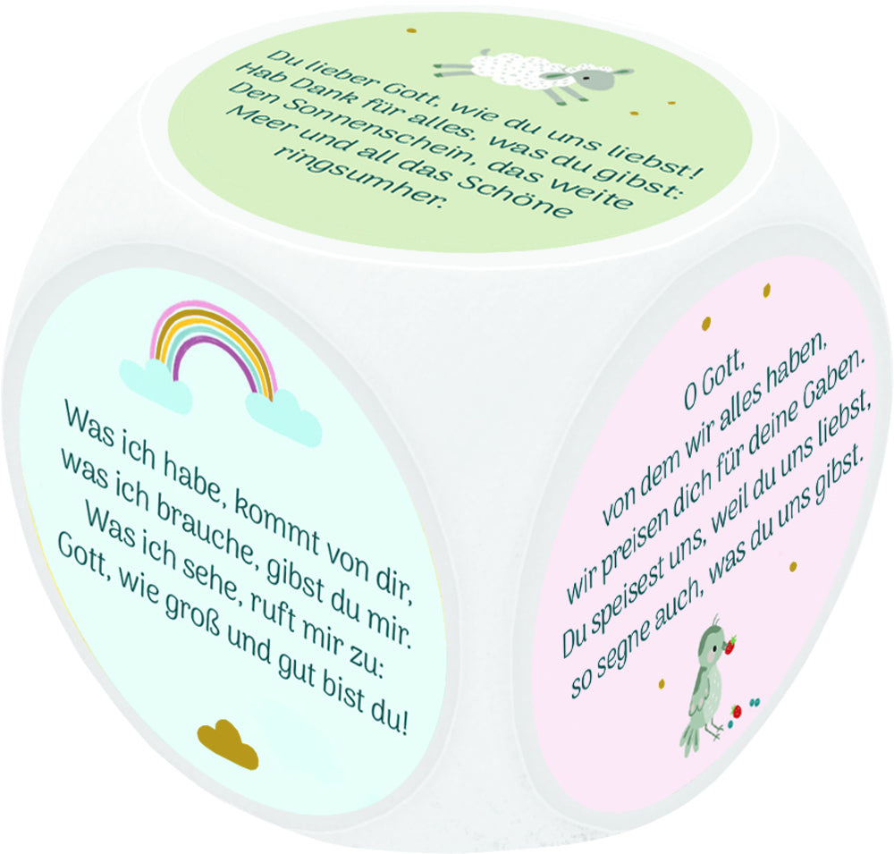 Holzwürfel 4-fbg. bedruckt mit Goldfolie / im Geschenkkarton Dieser fröhlich-bunte Gebetewürfel belebt das familiäre Tischgebetritual. In seiner wertigen Geschenkbox ist er gleich ansprechend als Geschenk verpackt
