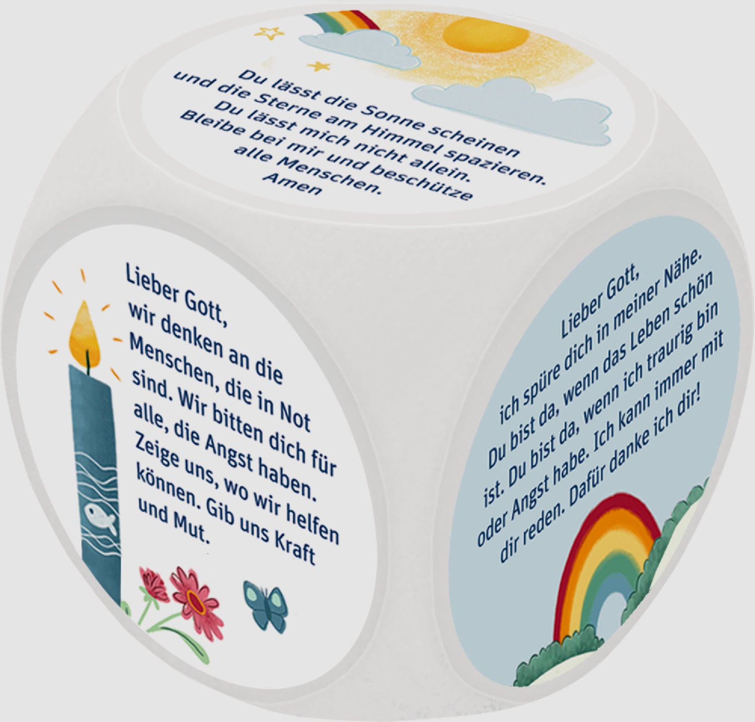 Holzwürfel 4-fbg. bedruckt mit Goldfolie / im Geschenkkarton Dieser farbenfrohe Würfel hilft spielerisch dabei, ein Gebetauszusuchen. Die sechs Gebete und Bilder sprechen von Frieden, von Dankbarkeit, von Trost und Liebe. Er ist ansprechend in einer Geschenkschachtel verpackt.