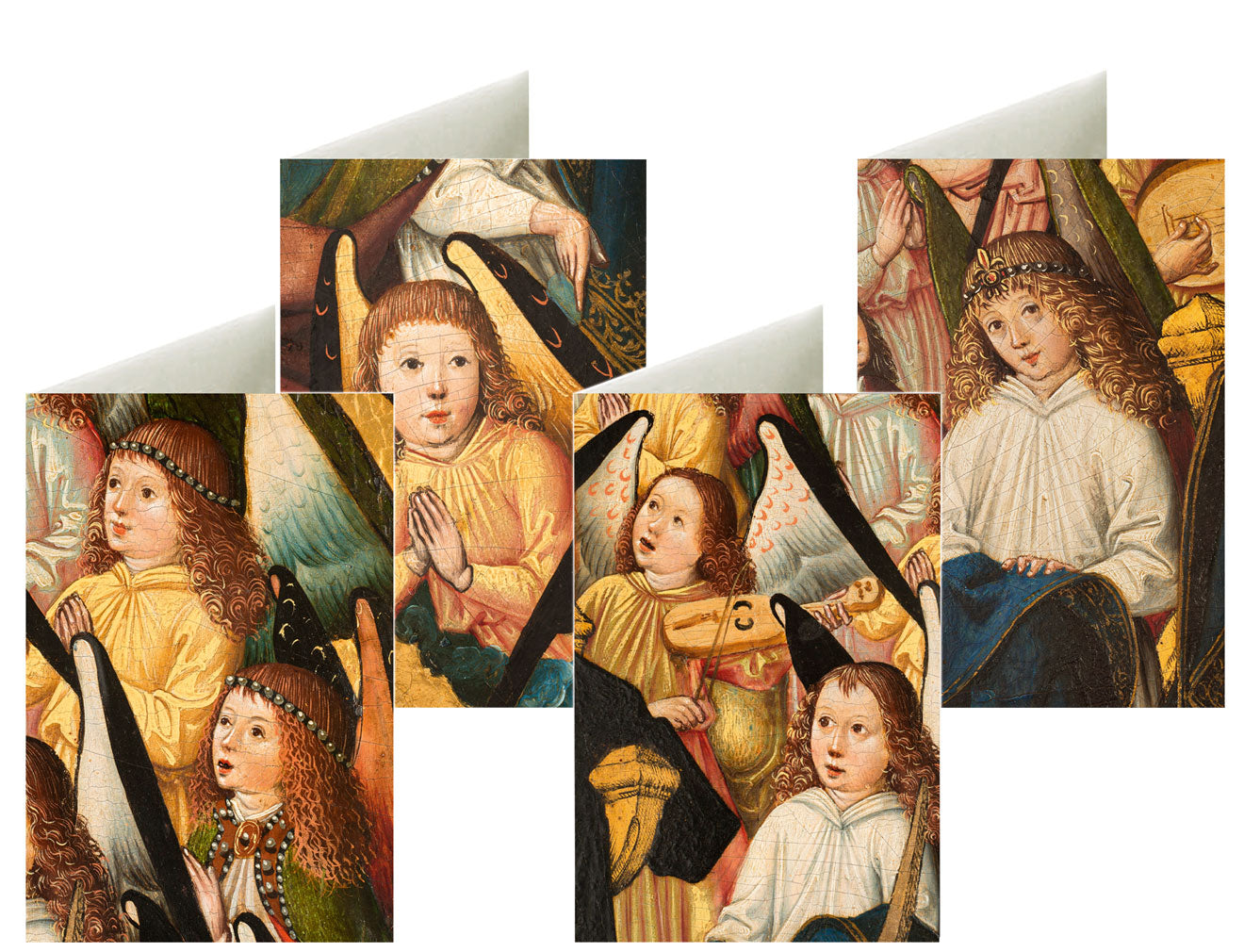 Aus der "Engelstriologie" im Museum Heylshof in Worms. Die detailreiche Darstellung des unbekannten Meisters der "Verherrlichung Mariae" begeistert! Tatsächlich kann man mit Geduld auf dem eindrucksvollen gotischen Tafelbild von 1470/80 "Verherrlichung Mariae" im Museum Heylshof in Worms 75 (!) verschiedene Engel zählen - betende, musizierende, singende, fliegende, aber auch vorwitzige und träumende. Wie eine Wolke umschließen sie Maria, die Himmelskönigin. Einige halten ihr blaues Gewand. Sie sind festlich mit Haarkränzen in den goldenen Engelslocken geschmückt. Das Briefkarten-Set beinhaltet je zwei Karten mit einem Engelspärchen und zwei einzelne Engel, die nicht nur zur Weihnachtszeit passen. / Das Museum Heylshof in Worms ist aus der Sammlung des Großindustriellen und Politikers Freiherr von Heyl (1843-1923) hervorgegangen, wird heute von seiner Familienstiftung getragen und erhält auch Unterstützung von der Deutschen Stiftung Denkmalschutz.
