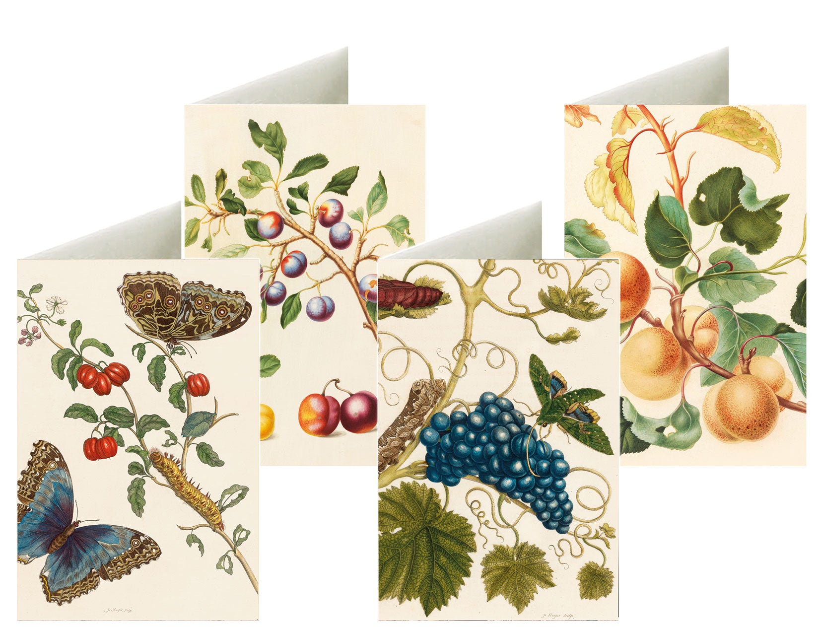 Sommerliche Frucht-Motive der Künstlerin und Naturforscherin Maria Sibylla Merian und ihrer Tochter Johanna Helena Herolt. Wunderbar geeignet für kunstvolle Glückwünsche und Grüße zu jedem Anlass. Einige der prachtvollsten Illustrationen der Barockkünstlerin und Naturforscherin Maria Sibylla Merian (1647-1717) befinden sich in ihrem "Surinambuch" von 1705. Auch ihre Tochter Johanna Helena Herolt widmete sich den Motiven der Botanik. Ihre Obst- und Blumenporträts wirken dabei etwas dreidimensionaler und feiner in den Farbübergängen, aber ebenso ansprechend und zeitlos. Das Kartenset "Früchtewelt" enthält die Motive "Barbadoskirsche und Tagfalter", "Weinrebe und Nachtfalter mit Raupe und Puppe", "Zweig mit Pflaumen" und "Zweig mit Aprikosen".