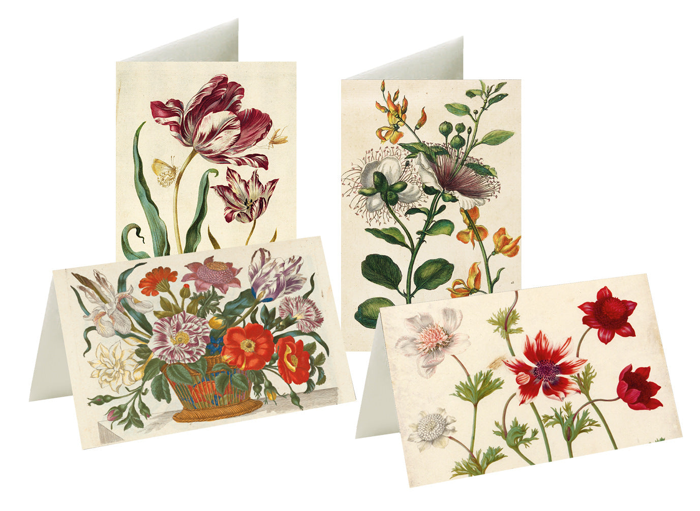 Das Tulpenbild stammt aus einem der drei bekannten von M. S. Merian selbst kolorierten Ausgaben ihres Blumenbuches in der Sächsischen Landesbibliothek Dresden (SLUB). Wie vom Winde verweht neigen sich die Blütenkelche zweier wertvoller geflammter Tulpensorten einander zu. Kaum kann man das Bild als Kupferstich erkennen, so feinlinig sind Blüten, Blätter und Flügel gestaltet. Der üppige Blumenkorb wurde in der Deutschen Nationalbibliothek Leipzig entdeckt. Aus einer späteren Ausgabe des Blumenbuches in der Stadtbibliothek Nürnberg stammt das feingliedrige Bild des Kapernstrauchs, deren spektakuläre weiß-lila Blüten reizvoll mit dottergelbem Ginster kombiniert ist. Ein besonderer Fund ist das Anemonen-Aquarell, das sich heute in der Klassik Stiftung Weimar befindet. Die Vereinzelung der Blüten vor hellem Grund erinnert an Blumenbücher, wie sie schon Maria Sibyllas Stiefgroßvater Theodor de Bry gedruckt hat. Auf ihren berühmten Vater, den Kupferstecher und Verleger Matthäus Merian d. Ä., verweist die Signatur am unteren Blattrand. Die vier Motive des Kartensets "Blumenwelt" stammen aus ihrer Nürnberger Zeit, wo sie mit ihrem Ehemann und den beiden Töchtern von 1668/70-1682 lebte.