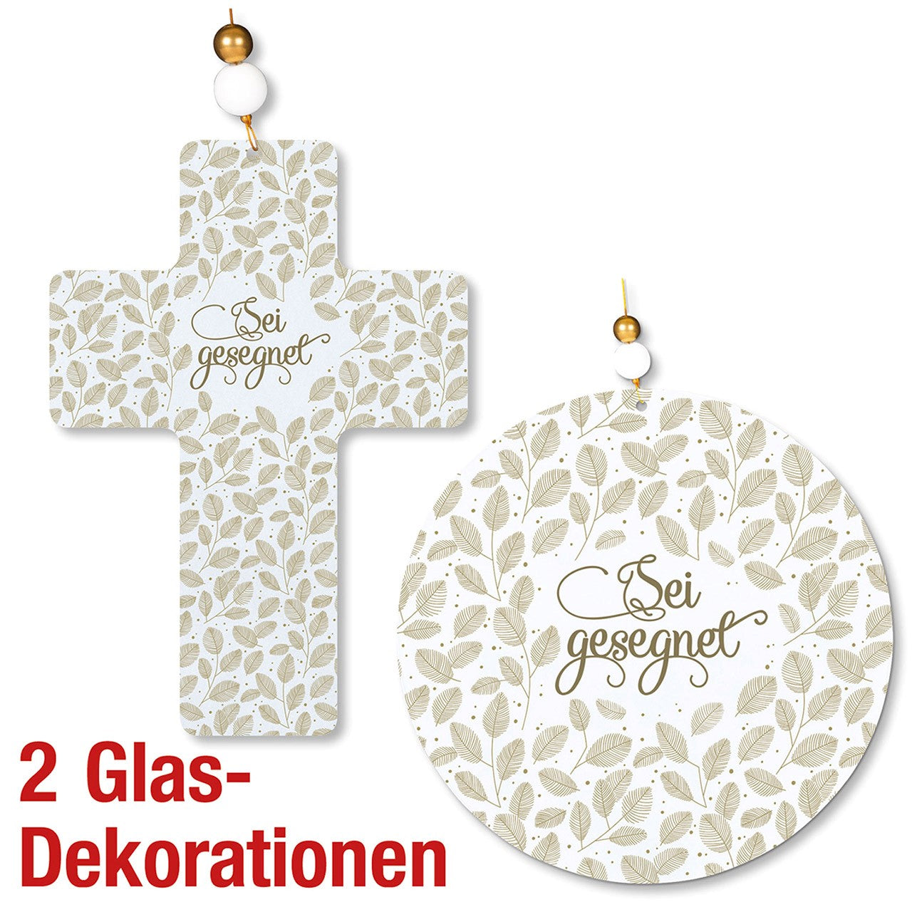 Inhalt: 1 x Glas-Kreuz (10 x 14,4 cm) plus 1 x Fensterbild (Durchmesser 12 cm). Jeweils Dekoration aus gefrostetem Glas, mit Goldfolien-Veredelung, farbig bedruckt und mit Perlen verziertem Golddraht im Loch zum Aufhängen an ein Fenster. //Schöne Glasdekorationen mit hochwertiger Veredelung. Aus Bedruckung, Gold-Veredelung und transparenten Bereichen im gefrosteten Glas entstehen im Gegenlicht filigrane Motive mit einer wohltuenden Botschaft. / Referenzpreis ist die Summe der Einzelpreise. Solange der Vorrat reicht!
