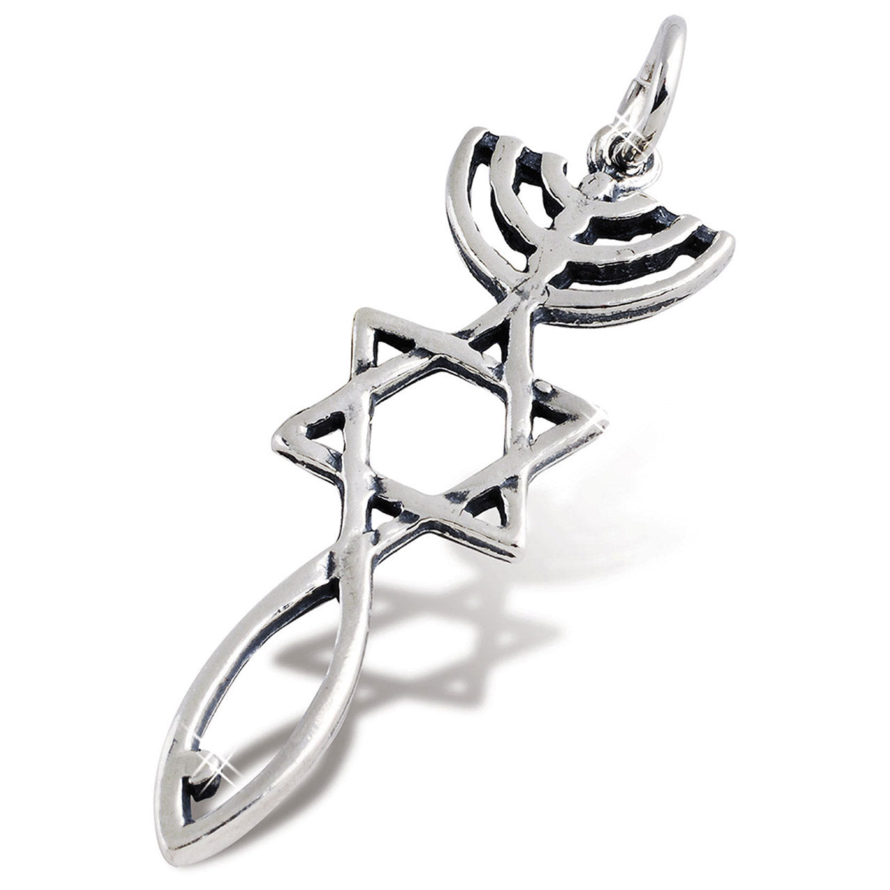 Anhänger Menorah-Davidstern-Ichthys. Altes, jüdisch-christliches Zeichen, das die Verbundenheit zwischen Judentum und Christentum symbolisiert. Das aus dem 2. Jahrhundert stammende Zeichen wurde auf verschiedenen Objekten in einer Grotte neben dem Berg Zion entdeckt.