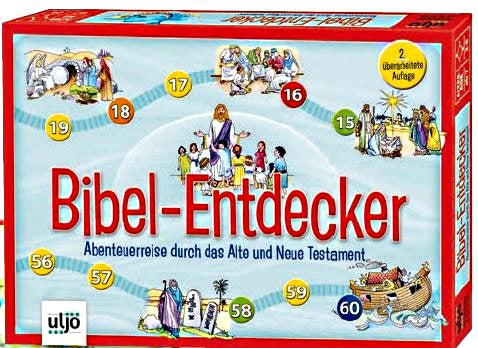 Inhalt: 6 Spielfiguren aus Holz, 1 Würfel, 1 Begleitheft mit Spielanleitung, 1 zweiseitig bedrucktes Spielbrett mit 25 Geschichten aus dem Alten und 22 Geschichten aus dem Neuen Testament. Für 2-6 Spieler ab 7 Jahren. Gesellschaftspiel mit 47 liebevoll handgemalten Szenen aus dem Alten und Neuen Testament, um spielerisch die wichtigsten Begebenheiten der Bibel kennenzulernen.