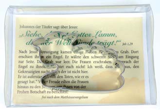 Aus Weißblech. Mit Einleger (Vorderseite:Ostergeschichte; Rückseite: Rezeptvorschlag für Plätzchen), verpackt im Organzabeutel.
