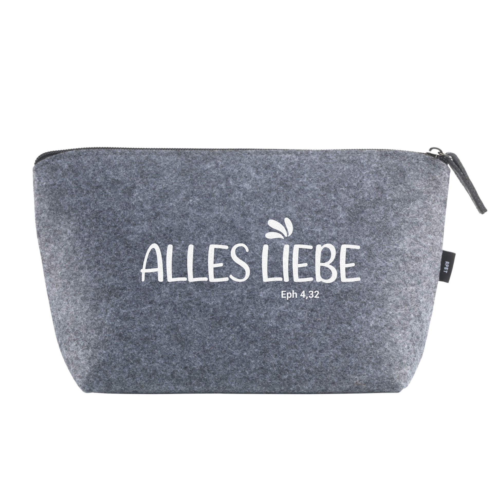 Multifunktionale Filz-Accessoire-Tasche aus RPET-Qualitätsfilz, hergestellt aus recycelten PET-Flaschen. Mit Reißverschluss.Idealer Organizer für unterwegs, Urlaubsreise, fürs Büro, Schule, … usw. Bedruckt mit dem liebevollem Vers "Alles Liebe Eph 4,32", Fassungsvermögen 800 ml.